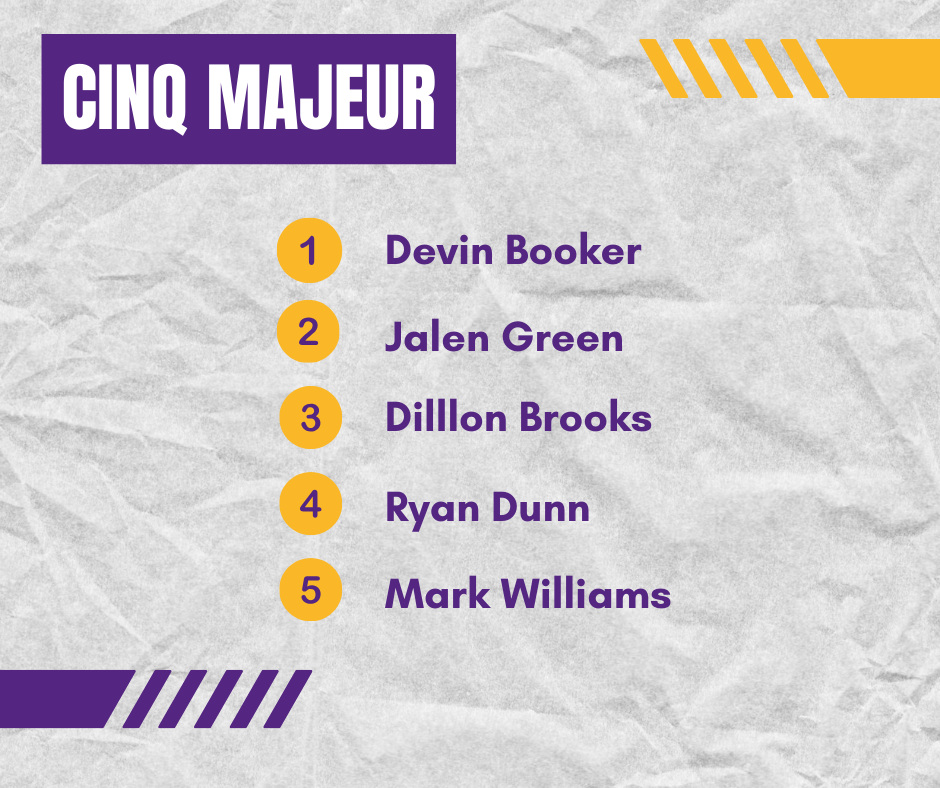 Sans surprise, Booker est maintenant franchise player après le départ de Kevin Durant. Le 5 sera aussi composé de Jalen Green, Dillon Brooks, et Mark Willliams, trois recrues qui viennent d’arrivée.