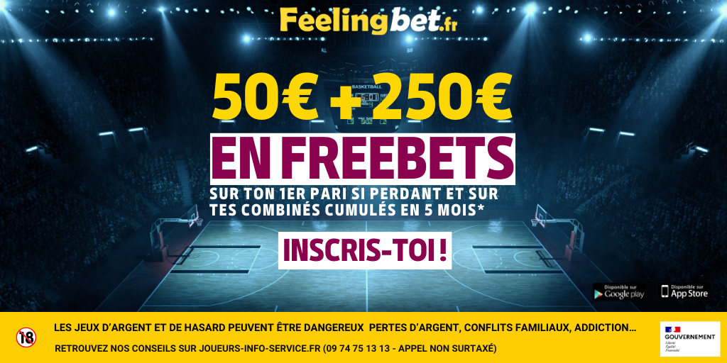 Tu veux parier sur l’Eurobasket et tu n’es pas encore inscrit sur Feelingbet.fr ? profite d’un 1er pari simple ou combiné remboursé à 100% en freebet s’il est perdant jusqu’à 50€, et jusqu’à 250€ de freebet fidélité supplémentaire sur tes paris combinés. Découvre l’offre et inscris-toi sur Feelingbet.fr > 🔞