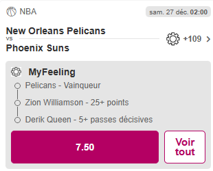 Matchs du 27/12 à partir de 01:00 – 9 matchs sont au programme cette nuit ! Les Clippers, forts de deux victoires récentes contre Houston et les Lakers, ont retrouvé un certain équilibre collectif. Malgré tout, ils restent 13e de la conférence ouest avec un bilan de 8-21, payant leur mauvais début de saison. Les Trail Blazers de Portland, 10e de la même conférence avec 12-18, restent sur deux défaites consécutives. Nous misons sur une victoire des Clippers (@1.65) ✅. Dans les autres rencontres, nous voyons les Celtics, avec un collectif bien huilé, s’imposer à Indiana (@1.24), ✅ les Hornets venir à bout d’Orlando (@2.97) ✅ et les Pelicans de New Orleans l’emporter à domicile contre Phoenix (@2.37).