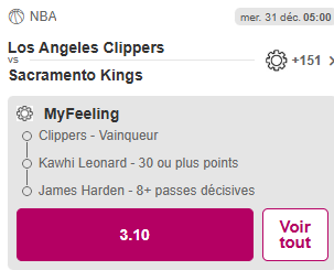 Matchs du 31/12 à partir de 02:00 – 4 rencontres de NBA au programme cette nuit ! Totalement relancés après un début de saison compliqué, les Clippers de Los Angeles affichent un visage méconnaissable ces derniers jours en alignant quatre victoires de rang face à des adversaires bien classés, une série qui leur permet de reprendre confiance malgré une 13e place à l’Ouest avec un bilan de 10-21. Sacramento, juste derrière au classement, occupe la 14e position avec seulement 8 succès pour 24 défaites et continue de montrer de grandes lacunes collectives sans réelle dynamique positive. Dans ce contexte, nous voyons les Clippers s’imposer dans cette rencontre (1.18) ✅, tandis que pour les autres affiches NBA, nous voyons Philadelphie l’emporter à Memphis (1.77) ✅, Boston s’imposer sur le parquet d’Utah (1.28) ✅ et Detroit renouer avec le succès face aux Lakers (1.67) ✅.
