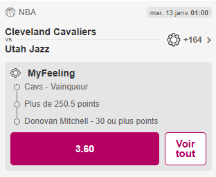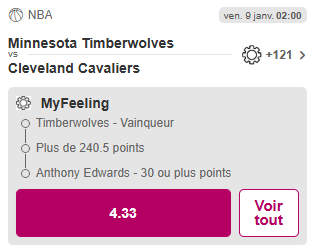 Matchs du 09/01 à partir de 01:00 – 4 rencontres de NBA au programme cette nuit ! Portés par une dynamique très solide avec trois succès consécutifs, les Timberwolves de Minnesota impressionnent par la stabilité de leur défense et la cohésion de leur collectif, une montée en puissance qui les installe à la 5e place de la conférence Ouest avec un bilan de 24-13. En face, Cleveland semble également retrouver des couleurs, affichant quatre victoires sur ses cinq dernières sorties et occupant actuellement la 6e position de la conférence Est avec un bilan de 21-17. Dans ce choc entre équipes en forme, nous voyons Minnesota, en pleine confiance et soutenu par son public, s’imposer à domicile (@1.62) ✅. Pour vos pronostics NBA, nous voyons aussi les Hornets et leur jeune groupe venir à bout d’Indiana (@1.53), Miami s’imposer sur le parquet de Chicago (@1.33) et les Mavericks de Dallas repartir victorieux de leur déplacement à Utah (@1.33).