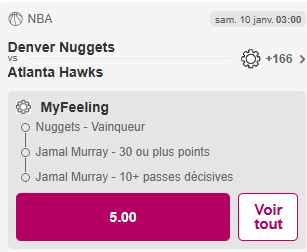 16/12 03:30 – Nikola Jokic, le pivot serbe qui dirige le jeu offensif de son équipe, tourne cette saison à 29,5 points de moyenne et voit ses responsabilités amplifiées avec les absences de coéquipiers clés. En pleine forme, il sort de trois matchs à 36, 28 et 40 points. Dans une rencontre qui s’annonce disputée et où il aura un rôle central pour la victoire de son équipe, nous voyons Nikola Jokic inscrire plus de 27,5 points dans cette rencontre.