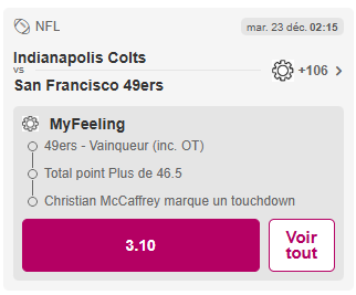 ➡️ Indiana Colts – San Francisco 49ers : Victoire 49ers @1.31 ✅